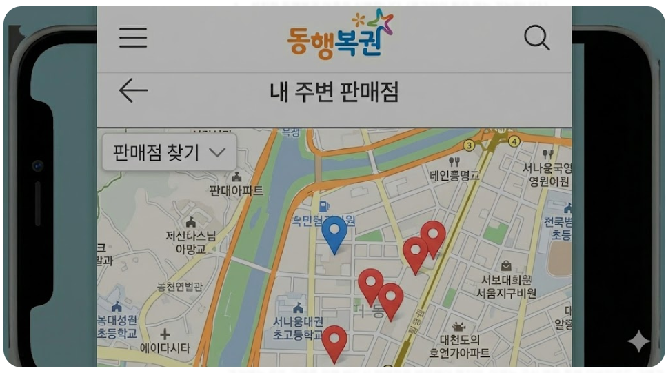 ▲ '내 주변 판매점' 기능을 이용하면 현재 위치에서 가장 가까운 로또 및 연금복권 판매점을 지도에서 바로 확인할 수 있습니다.