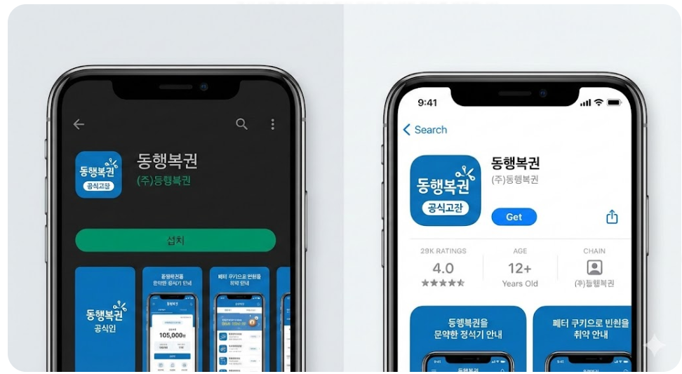 ▲ 구글 플레이스토어(좌)와 애플 앱스토어(우)에서 확인할 수 있는 공식 동행복권 앱의 모습입니다. 개발사가 '(주)동행복권'인지 꼭 확인하세요.