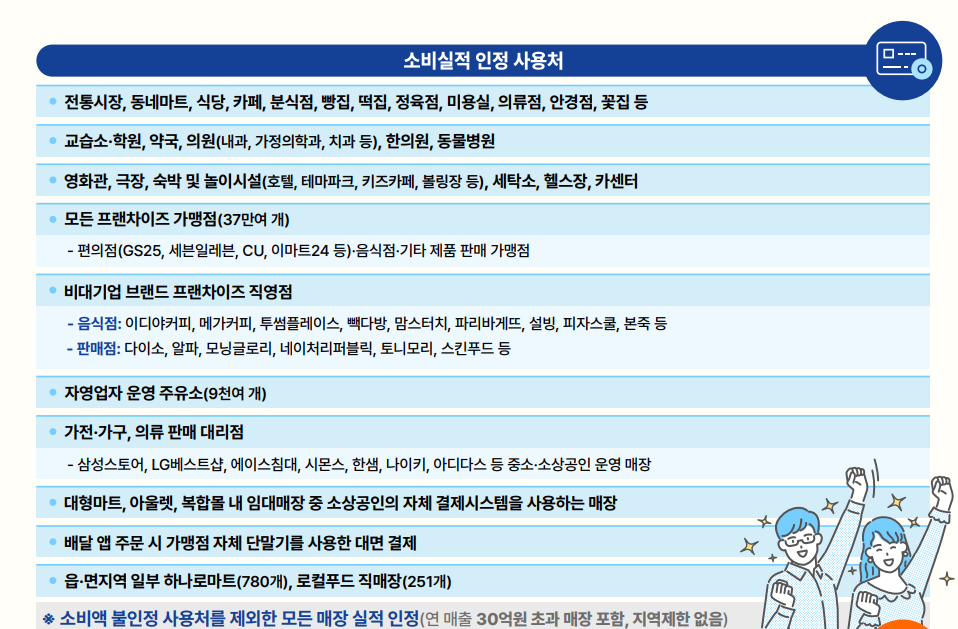- 인정 사용처 이유: 이 제도는 지역 내 소비 진작 + 소상공인 지원을 목적으로 하므로, 중소・소상공인이 운영하는 매장이 중심입니다. 카드사 안내에서도 “국내 중소·소상공인이 운영하는 매장”이 실적 인정 기준이라고 명시되어 있어요.