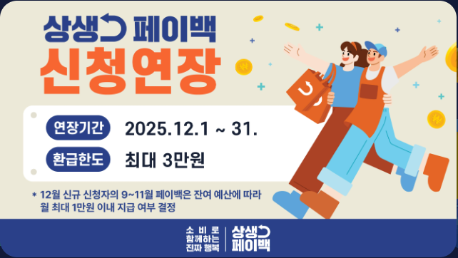 상생페이백 사업은 처음에는 11월 말까지 신청이 가능했지만, 많은 소비자들의 요청과 예산 상황을 고려해 “12월 1일부터 12월 31일까지” 한 달 더 신청 기간이 연장되었습니다.