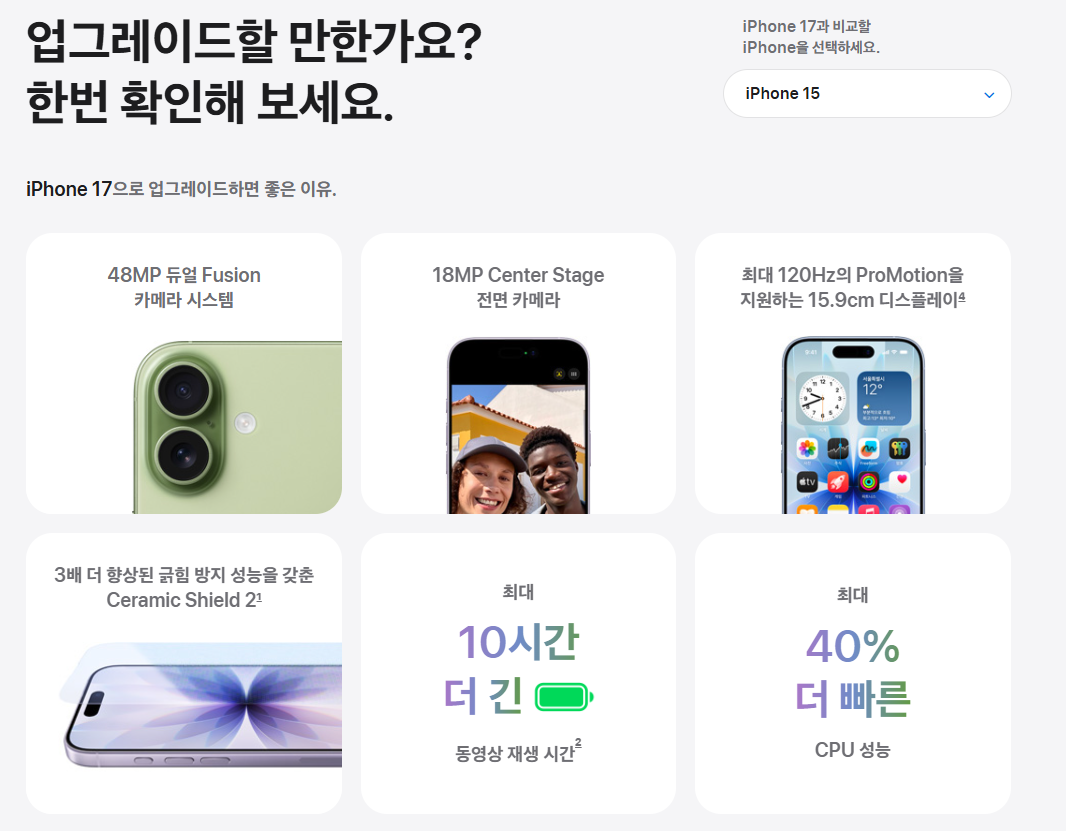 | 아이폰17 | 6.1” OLED 120Hz | A18 | 듀얼 48MP | 22시간 | 학생·일반 사용자 |