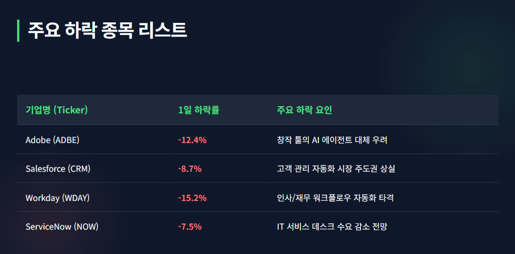 이번 미국 소프트웨어 주식 폭락은 특정 기업만의 문제가 아닙니다. 그동안 고평가 논란이 있었던 B2B(기업 간 거래) 소프트웨어 기업들이 직격탄을 맞았습니다.