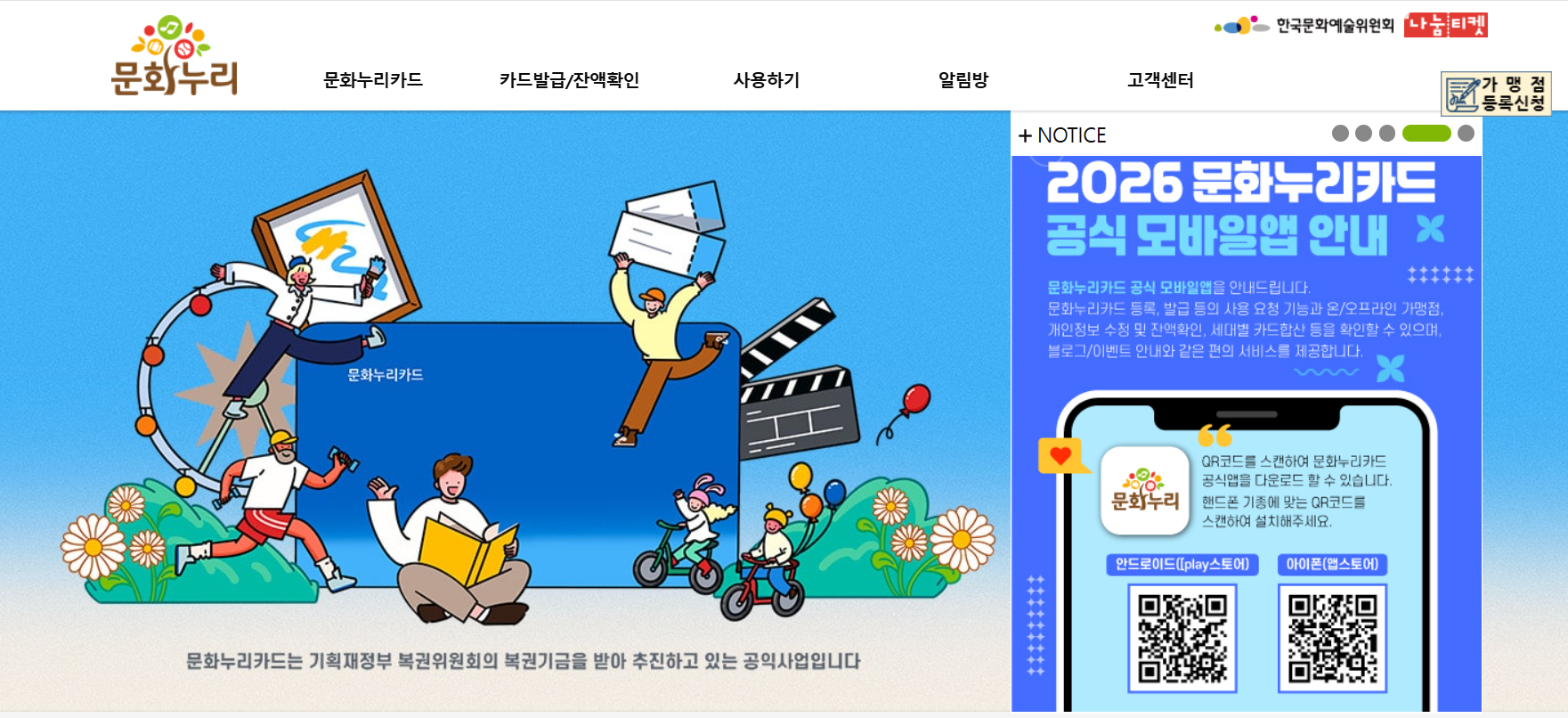 - 문화누리카드 홈페이지(www.mnuri.kr) 또는 모바일 앱에 접속합니다.