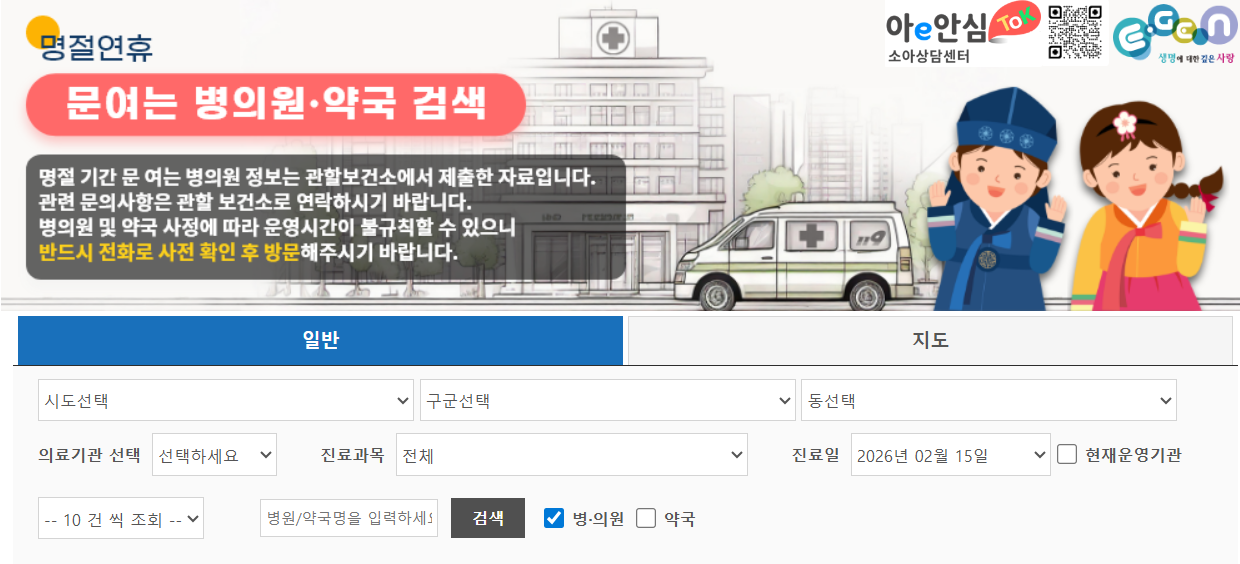 - 확인 방법: 사이트 접속 후 [병원/약국] 메뉴에서 현재 진료 가능한 2026 설 연휴 문 여는 병원을 지역별로 검색할 수 있습니다.